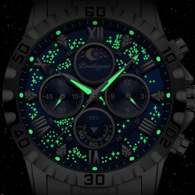 פונקציות: תצוגת שלבי ירח, אזור זמן כפול, מחוגים זוהרים בחושך וכרונוגרף מדויק.