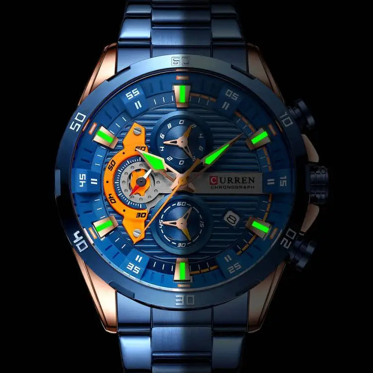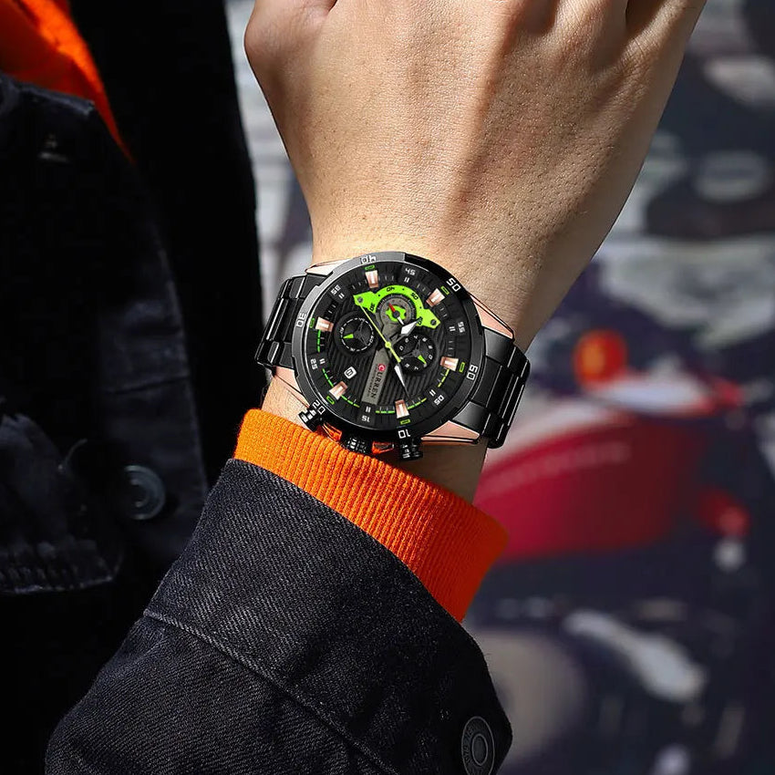 שעון גברים יוקרתי בעיצוב מודרני ומרשים עם מראה אלגנטי וייחודי. מנגנון קוורץ איכותי מתוצרת יפן, בעל פונקציית כרונוגרף מלאה.